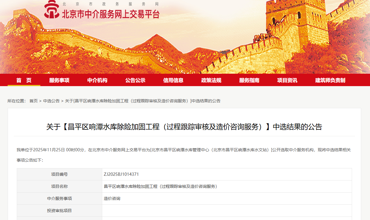 2025年11月25日,由北京市中介服务网上交易平台发布, 昌平区响潭水库除险加固工程(过程跟踪审核及造价咨询服务)中选结果的公告,北京永达信工程咨询有限公司中标成为昌平区响潭水库除险加固工程(过程跟踪审核及造价咨询服务)项目服务商。(信息摘自北京市中介服务网上交易平台)